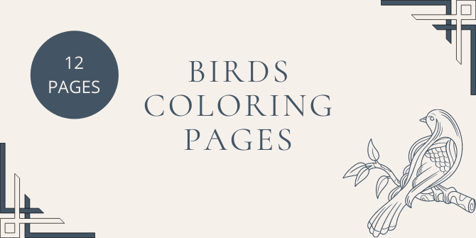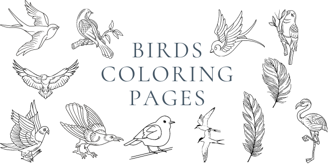 Birds coloring pages - 10 birds + 2 feathers coloring sheets for kids